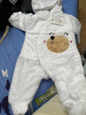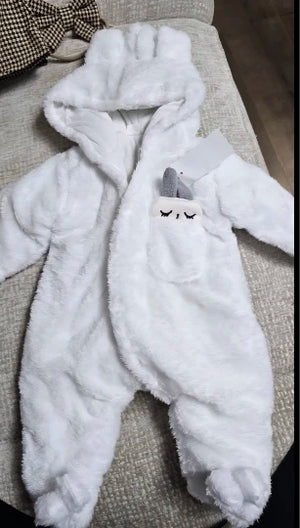 The romper is crafted with plush cotton and polyester, ensuring your baby stays warm and comfortable even during chilly winter days.